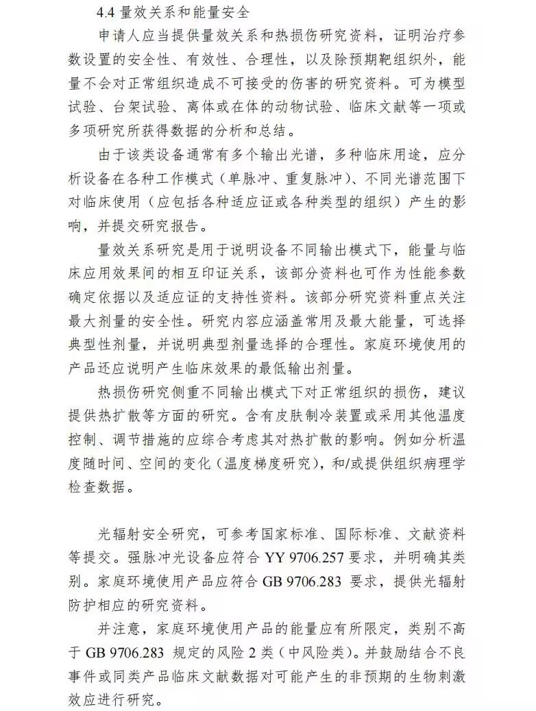 同時根據《強脈沖光治療設備注冊審查指導原則(2023年修訂版)》的第4部分研究資料中的4.4量效關系和能量安全章節提出:申請人應當提供量效關系和熱損傷研究資料,證明治療參數設置的安全性、有效性、合理性。由于該類設備通常有多個輸出光譜,多種臨床用途,應分析設備在各種工作模式(單脈沖、重復脈沖)、不同光譜范圍下對臨床使用(應包括各種適應證或各種類型的組織)產生的影響,并提交研究報告,以及除預期靶組織外,能量不會對正常組織造成不可接受的傷害的研究資料。